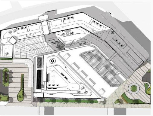 (1)公共广场。在建筑西侧设置急诊人流入口及广场,东侧设置住院人流入口及广场。两个广场之间阻而不隔,还结合转弯路径设置了绿化景观。解决人流车流交通问题的同时,给就诊病人以亲切舒适健康的环境感受。公共广场布置图如图 4 所示。